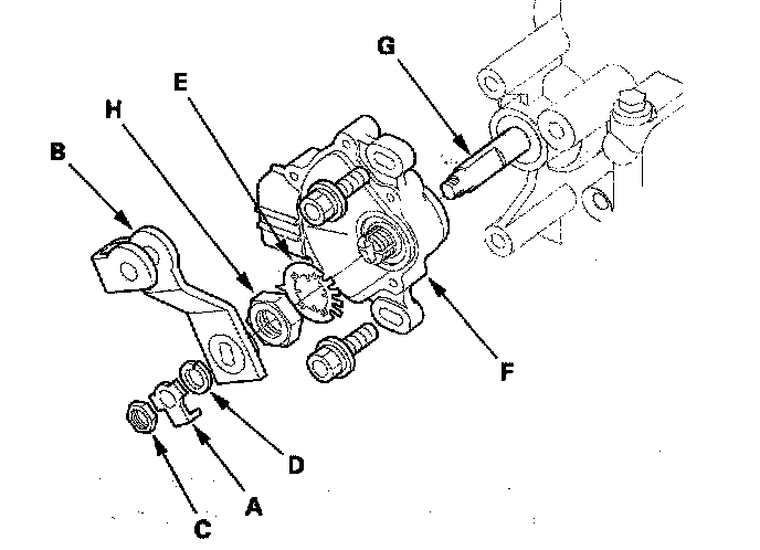 11. Pry the lock tabs of the lock washer (E) on the transmission range switch (F), hold the selector control shaft (G) with a 6.0 mm wrench, and loosen the locknut (H).