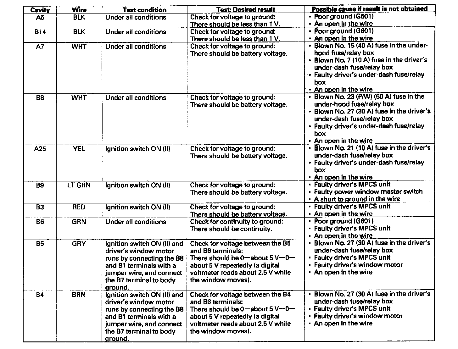 - If all the input tests prove OK, the control unit must be faulty; replace the driver's MPCS unit and go to step 7.