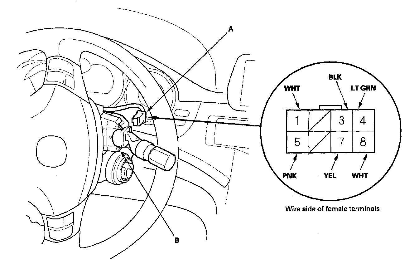 4. Disconnect the 8P connector (A) from the wiper/washer switch (B).