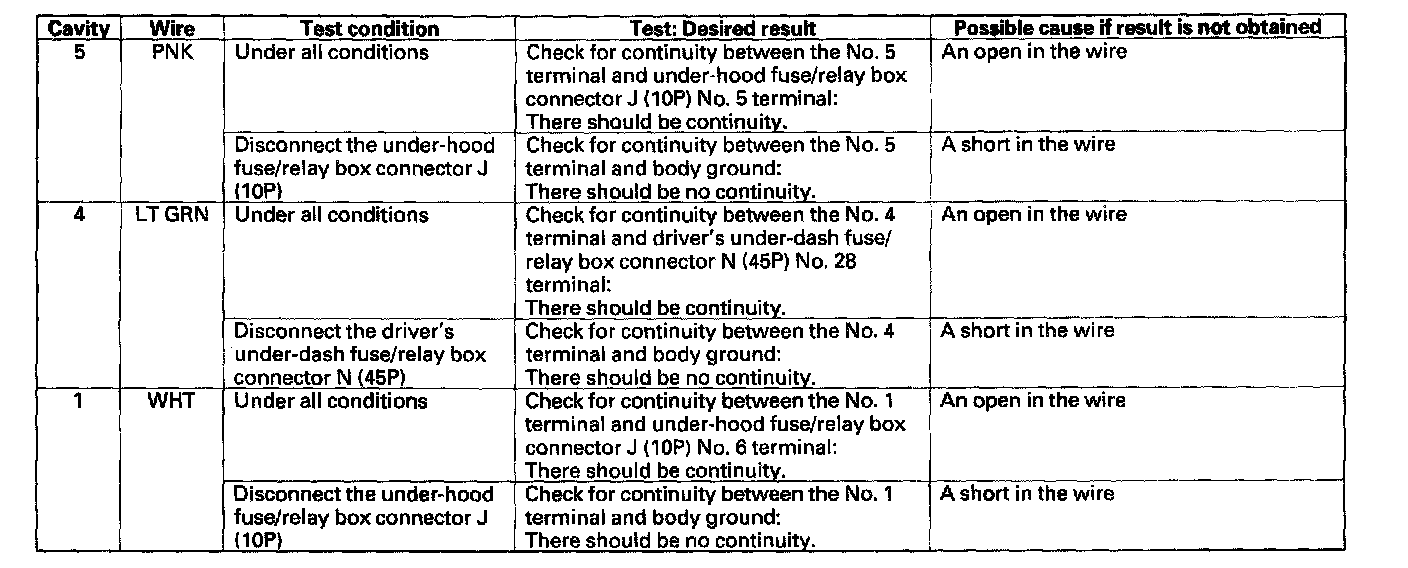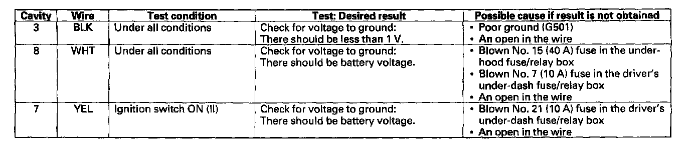 7. Reconnect the 8P connector to the wiper/washer switch, and make these input tests at the connector.