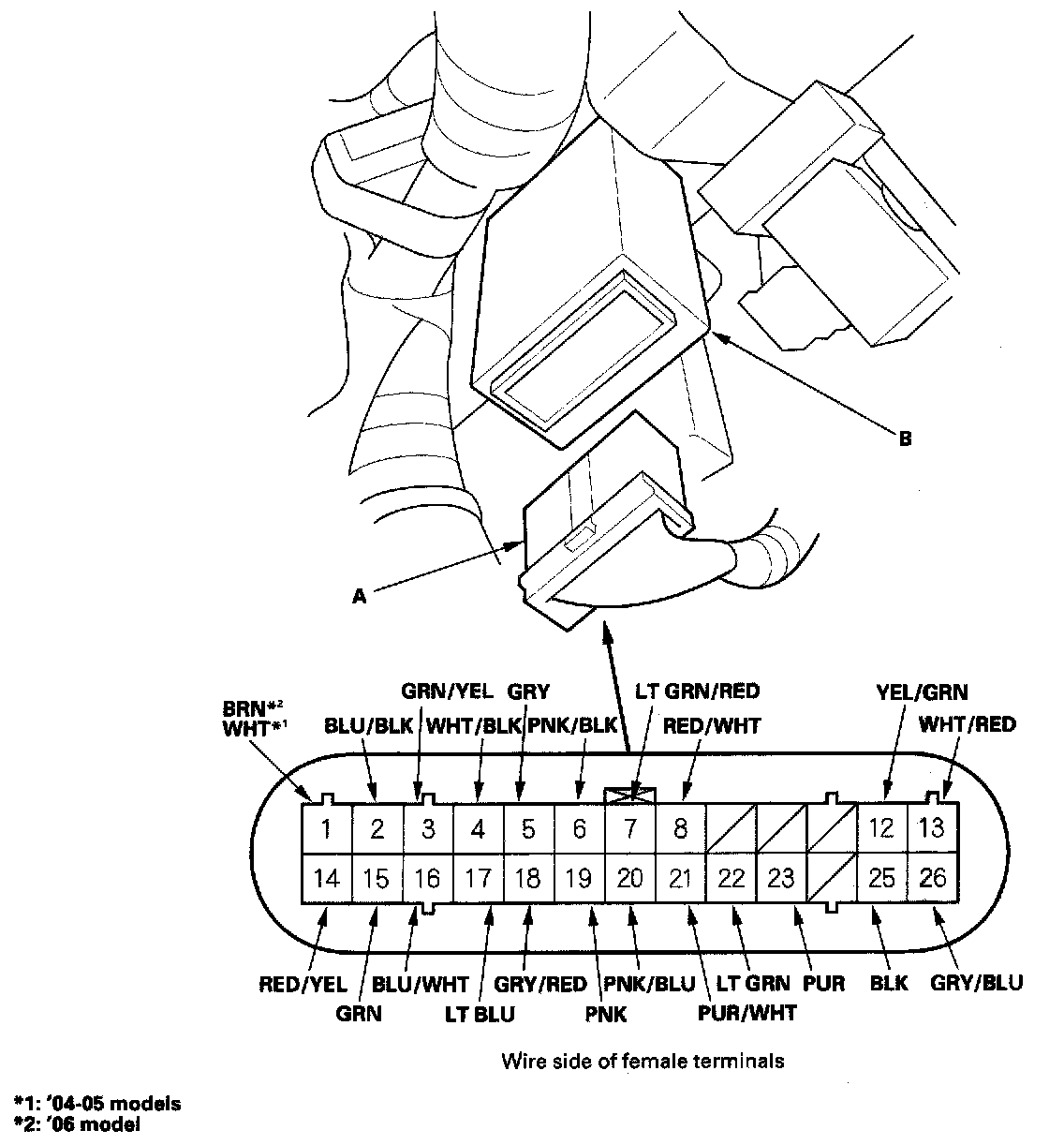 3. Disconnect the 26P connector (A) from the power mirror control unit (B).