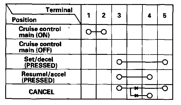 - If there is continuity, and it matches the table, but switch failure occurred on the cruise control input test, check and repair the wire harness on the switch circuit.