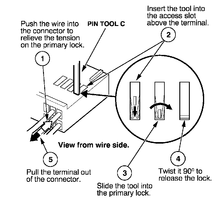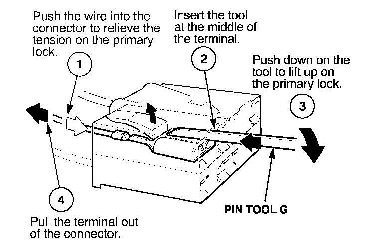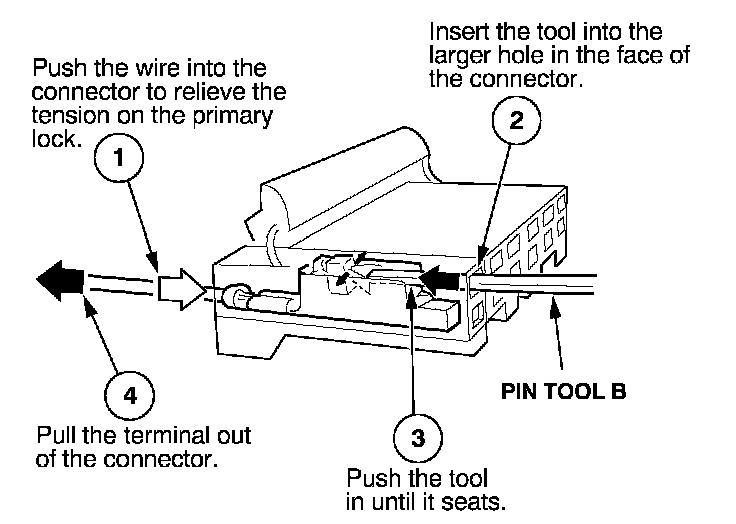 Before you begin, inspect the wire you are about to repair for damage and length. Make sure the wire will be long enough to make a terminal repair without stretching it when you reinstall the terminal in the connector. If the wire is too short, or if access to the connector is too restricted to make a terminal repair, you may need to install a pigtail terminal (a short length of wire with a factory-crimped terminal on it). Refer to HOW TO INSTALL PIGTAIL TERMINALS.
