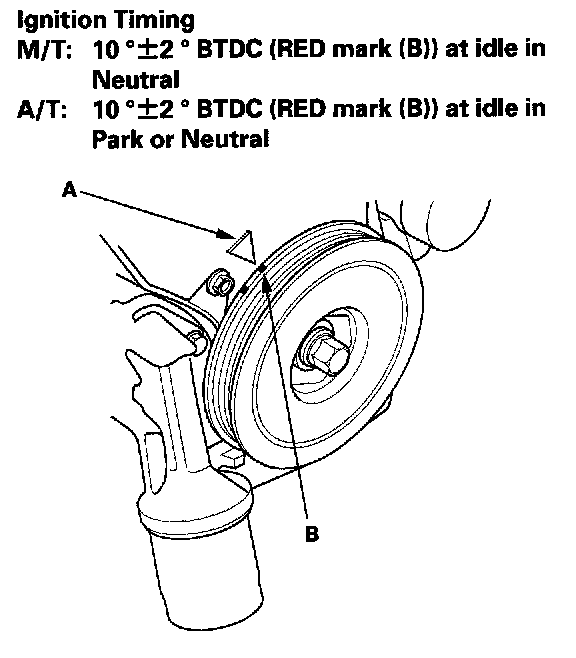7. Aim the light toward the pointer (A) on the timing belt cover. Check the ignition timing under a no load condition, (headlights, blower fan, rear window defogger, and air conditioner are turned off).