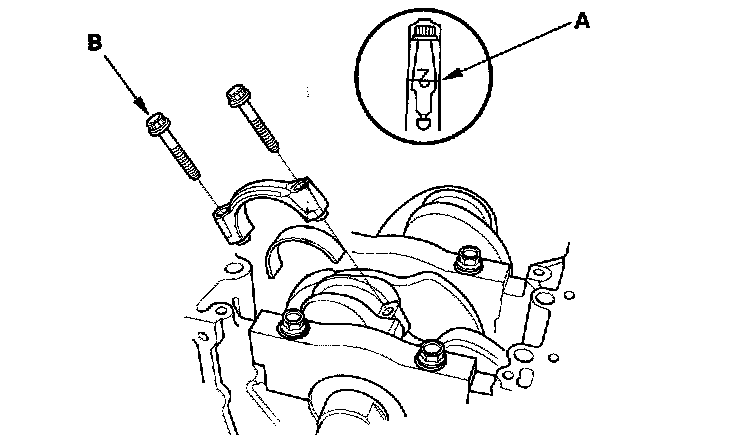 Apply new engine oil to the bolt threads and flanges. Torque the bolts (B) to 20 Nm (2.0 kgf-m, 14 ft. lbs.).
