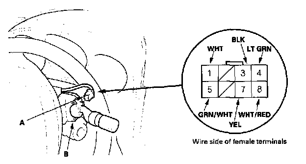 4. Disconnect the 8P connector (A) from the wiper/washer switch (B).