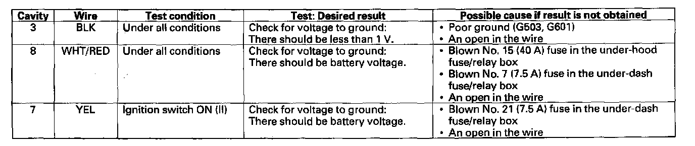 6. Reconnect the connector, and make these input tests at the connector.