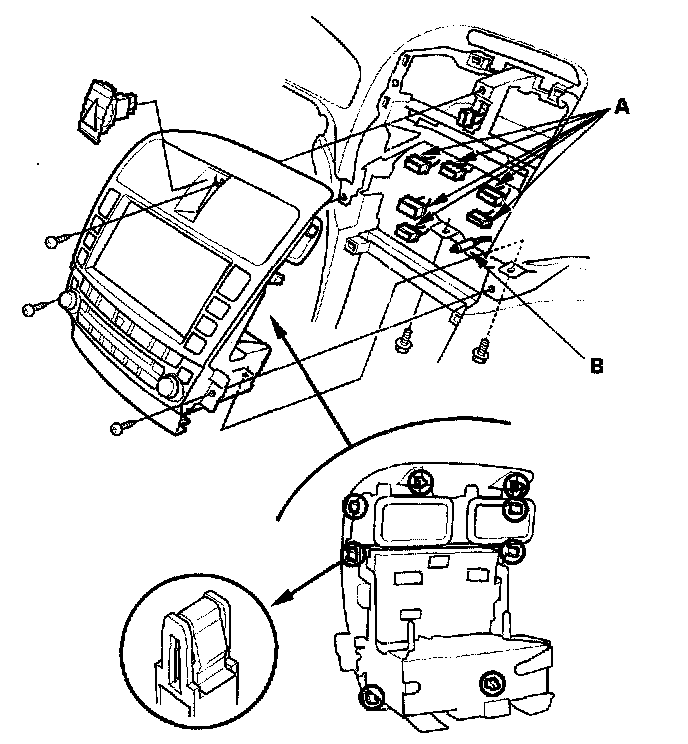 7. Remove the screws and bolts. Disconnect the audio-HVAC display module connectors (A) and the antenna lead (B), then remove the audio-HVAC display module.