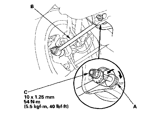 3. Hold the adjusting bolt (A) on the rear control arm (B), and loosen the self-locking nut (C).