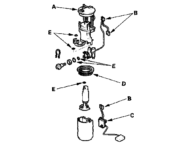 4. Install the parts in the reverse order of removal with a new base gasket (D) and new 0-rings (E). When installing the fuel tank unit, align the marks on the unit and the fuel tank.
