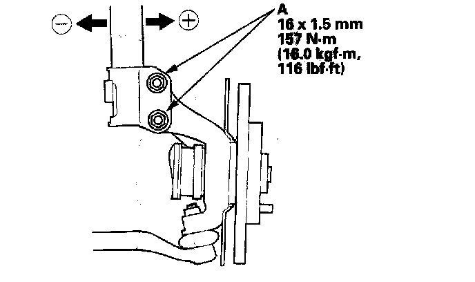 2. Loosen the flange nuts (A) and bolts, and adjust the camber by moving the bottom of the damper within the range of the damper pinch bolt free play. Tighten the flange nuts to the specified torque.