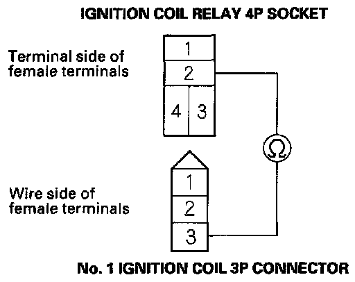 5. Check for continuity between ignition coil relay 4P socket terminal No. 2 and No. 1 ignition coil 3P connector terminal No. 3.