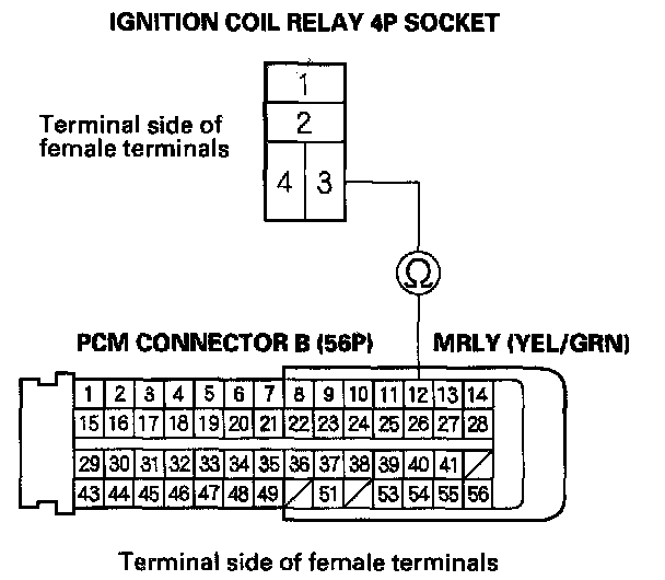 NO - Repair an open in the wire between ignition coil relay 4P socket terminal No. 3 and the PCM (B12).