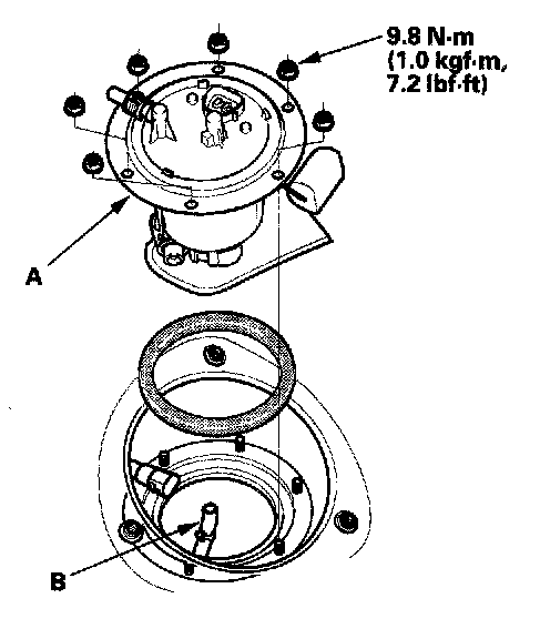 6. Remove the fuel tank unit (A), and disconnect the transfer tube (B).