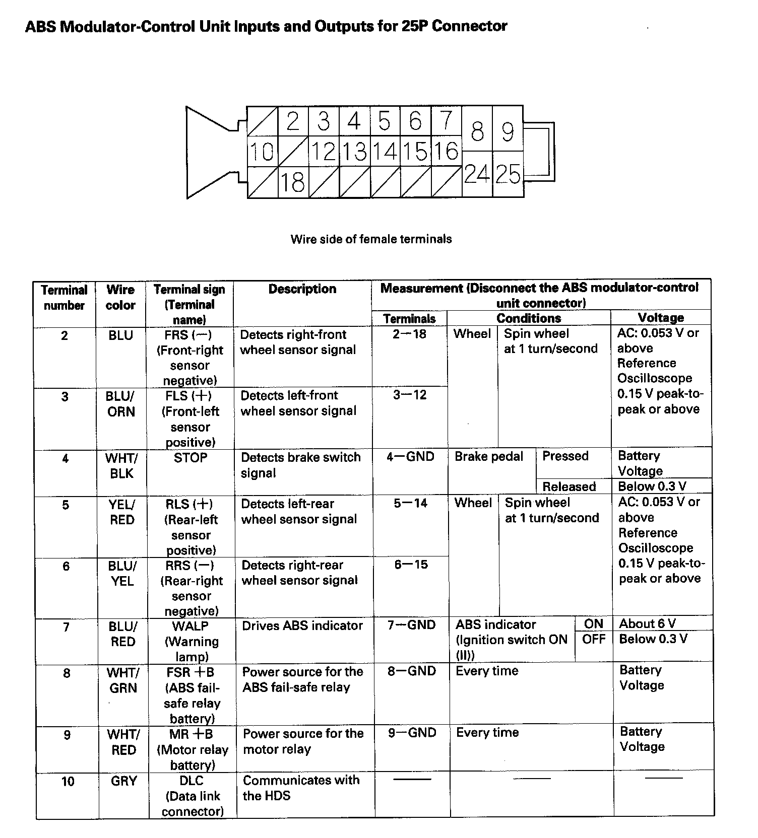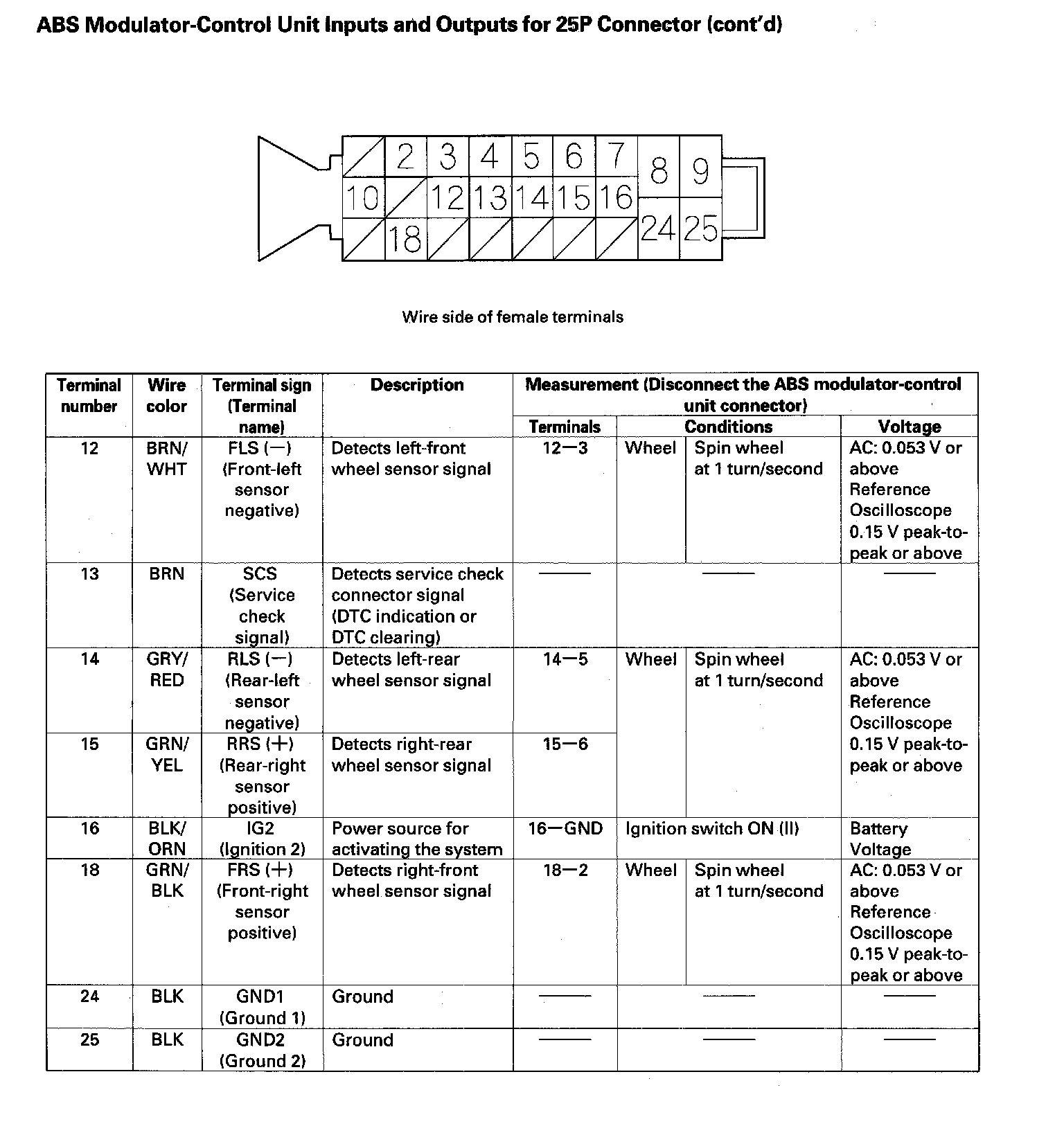 ABS Modulator-Control Unit Inputs and Outputs for 25P Connector: