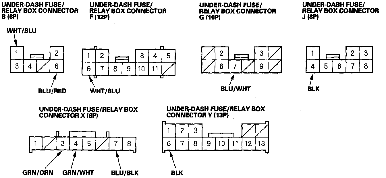 3. Disconnect the under-dash fuse/relay box connectors B, F, G, J, X and Y.