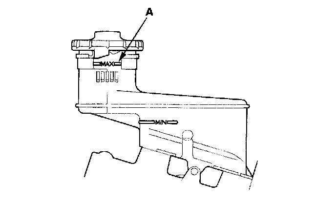 1. Make sure the brake fluid level in the reservoir is at the MAX (upper) level line (A).