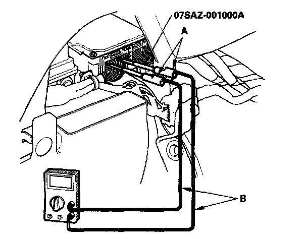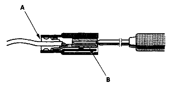 3. If you cannot get to the wire side of the connector or the wire side is sealed (A), disconnect the connector and probe the terminals (B) from the terminal side. Do not force the probe into the connector.