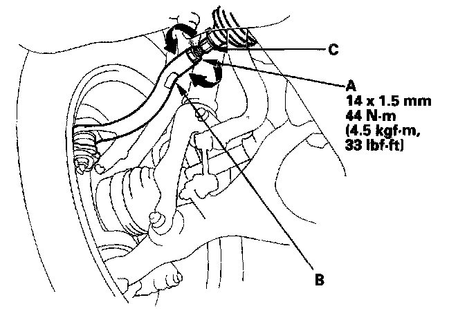 3. Hold the adjusting bolt (A) on the rear control arm (B), and loosen the self-locking nut (C).