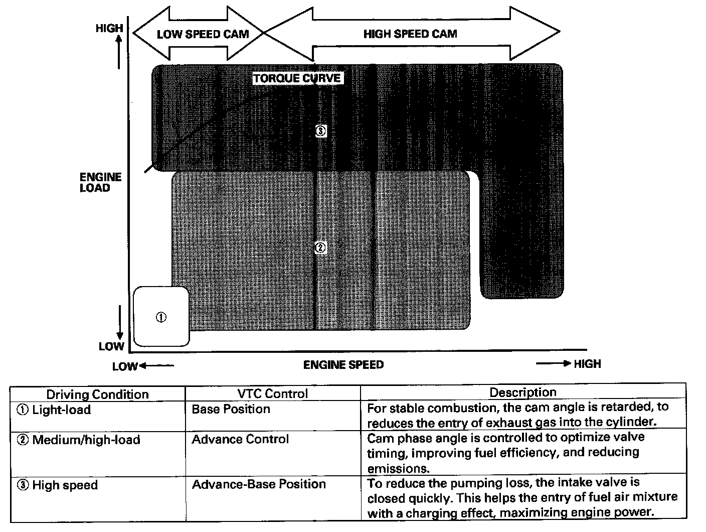 - The VTC system makes continuous intake valve timing changes based on operating conditions.