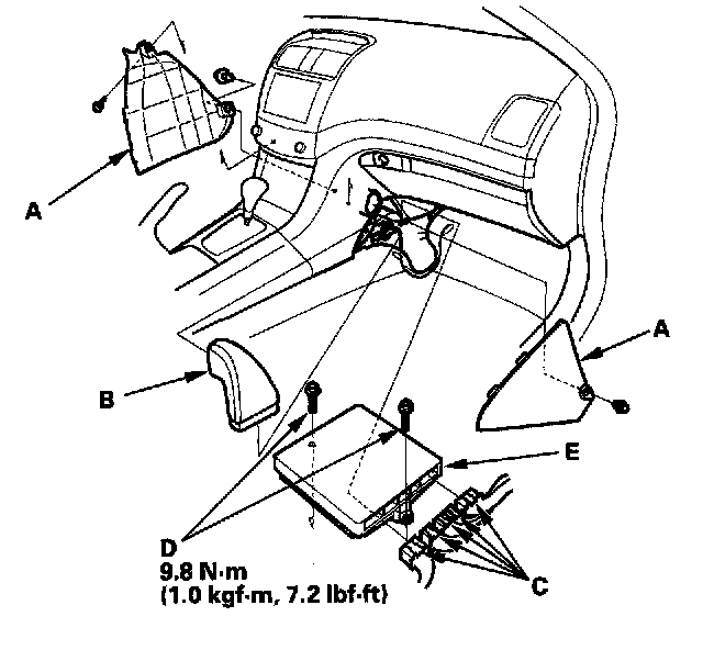 13. Remove the bolts (D), then remove the ECM/PCM (E).