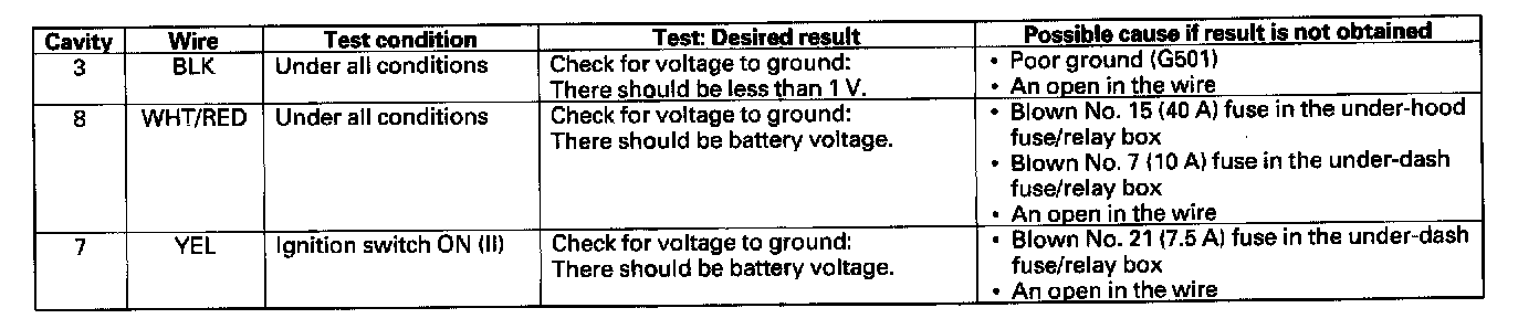 6. Reconnect the connector to the wiper/washer switch, and make these input tests at the connector.