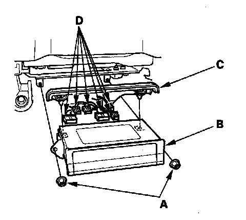 4. Remove the cover (C), then disconnect the navigation unit connectors (D).