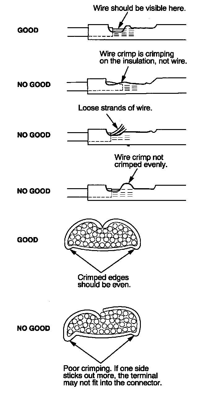 8. Inspect the quality of the wire crimp. If it has any of the following NO GOOD crimps, cut it off and start over.
