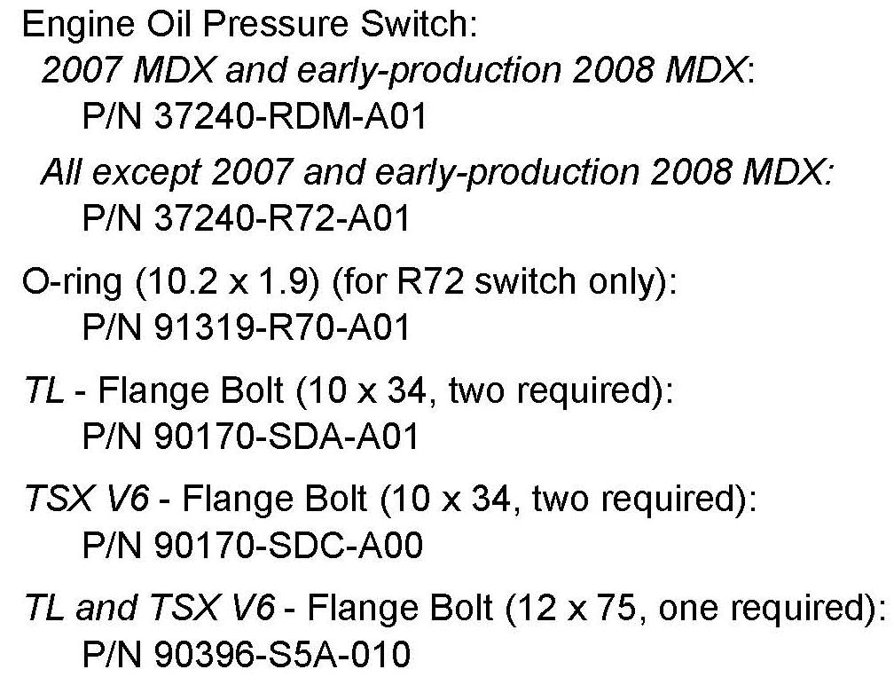 On 2007 MDXs and early-production 2008 MDXs, the threads of the oil pressure switch are different than all the other models listed, including later MDXs. To make sure you install the correct switch, use the oil pump ID information in step 3 of the REPAIR PROCEDURE.