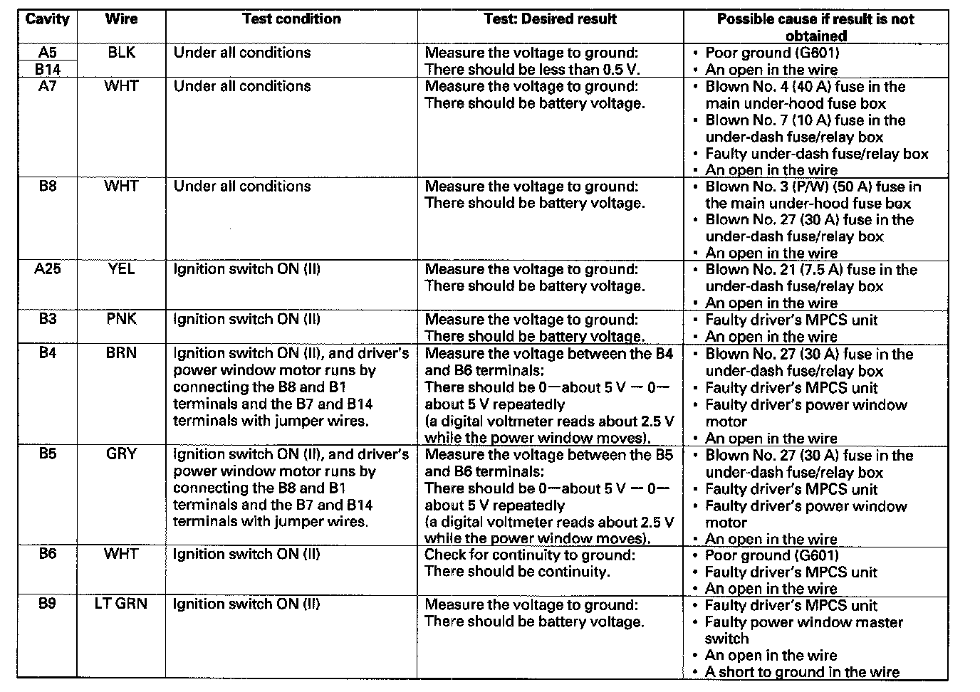 Home >> Acura >> 2007 >> MDX V6-3.7L >> Repair and Diagnosis >> Windows and Glass >> Windows >> Power Window Control Module >> Testing and Inspection >> Component Tests and General Diagnostics >> Driver's MPCS Unit Input Test