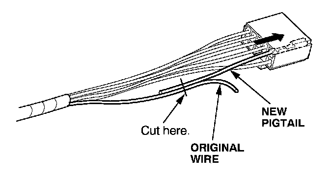 6. Lay the pigtail and the original wire side-by-side, and cut off both ends at once. If you are making more than one splice, do not cut each pigtail at the same location; the resulting "lump" of splice connectors would interfere with rewrapping the harness. Instead, cut the first pigtail close enough to the terminal so you will have room to make each remaining cut about 20 mm (3/4 inch) farther down on the next pigtail.