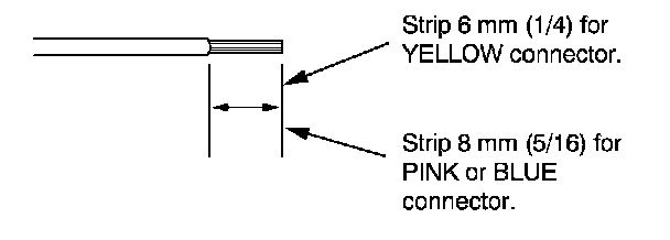 7. If you are using a yellow splice connector, strip about 6 mm (1/4 inch) of insulation off the ends of both wires. If you are using a pink or blue splice connector, strip off about 8 mm (5/16 inch) of insulation.