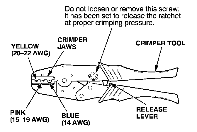 8. Put the splice connector in the proper size slot in the Crimper Tool, slide it to one end (where the flare begins), and close the crimper handles far enough to hold it in place. To release the ratchet mechanism at any point after the first click, squeeze the handles slightly and push the release lever, then let the handles open.
