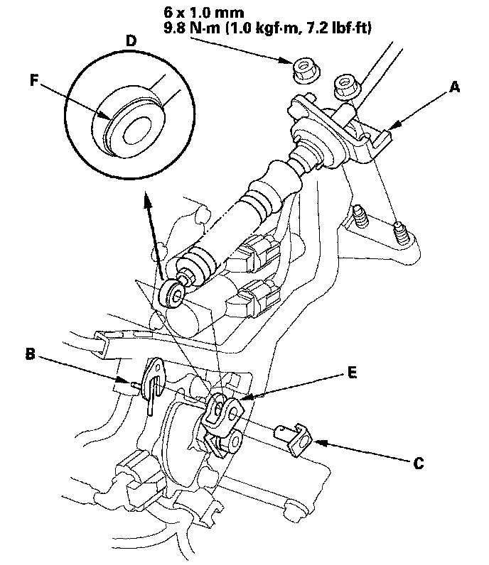 8. Check the synthetic resin bushing (F) in the shift cable end for a proper fit and wear. If the bushing is loose or worn, replace the shift cable.