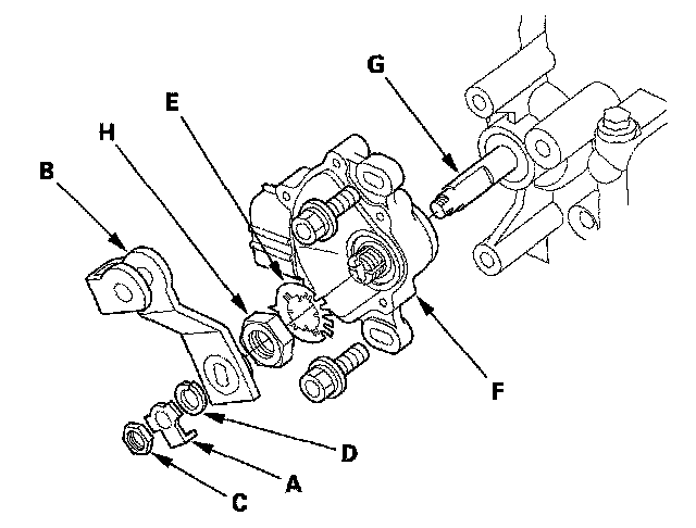 11. Pry the lock tabs of the lock washer (E) on the transmission range switch (F), hold the control shaft (G) with a 6.0 mm wrench, and loosen the locknut (H).