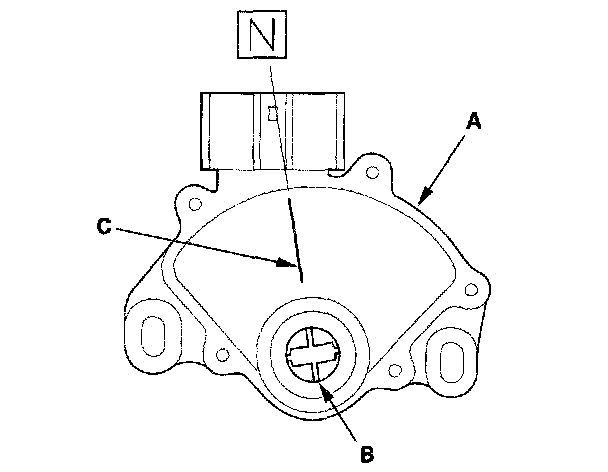 13. Set the new transmission range switch (A) to the N position. The transmission range switch clicks in the N position, and the control shaft hole (B) aligns with the N position line (C).