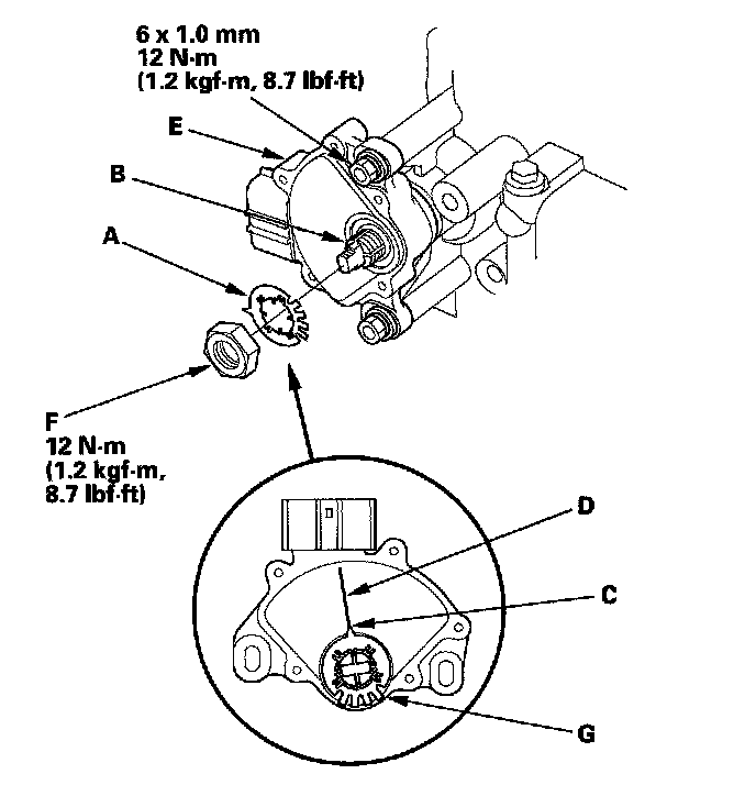 17. Push the locknut against the transmission housing to seat the transmission range switch into the control shaft, and tighten the locknut to 12 N-m (1.2 kgf-m, 8.7 lbf-ft) while holding the control shaft with a 6.0 mm wrench, then bend the lock tabs (G) against the locknut.