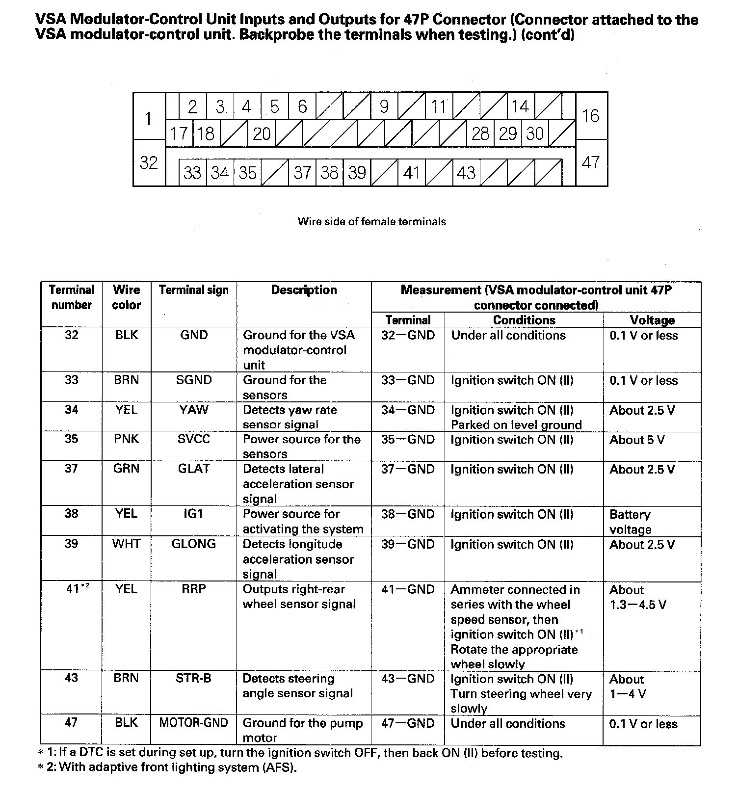 VSA Modulator-Control Unit Inputs And Outputs For 47P Connector (Connector Attached To The VSA Modulator-Control Unit. Backprobe The Terminals When Testing.)VSA Modulator-Control Unit Inputs And Outputs For 47P Connector (Connector Attached To The VSA Modulator-Control Unit. Backprobe The Terminals When Testing.) (Part 1):