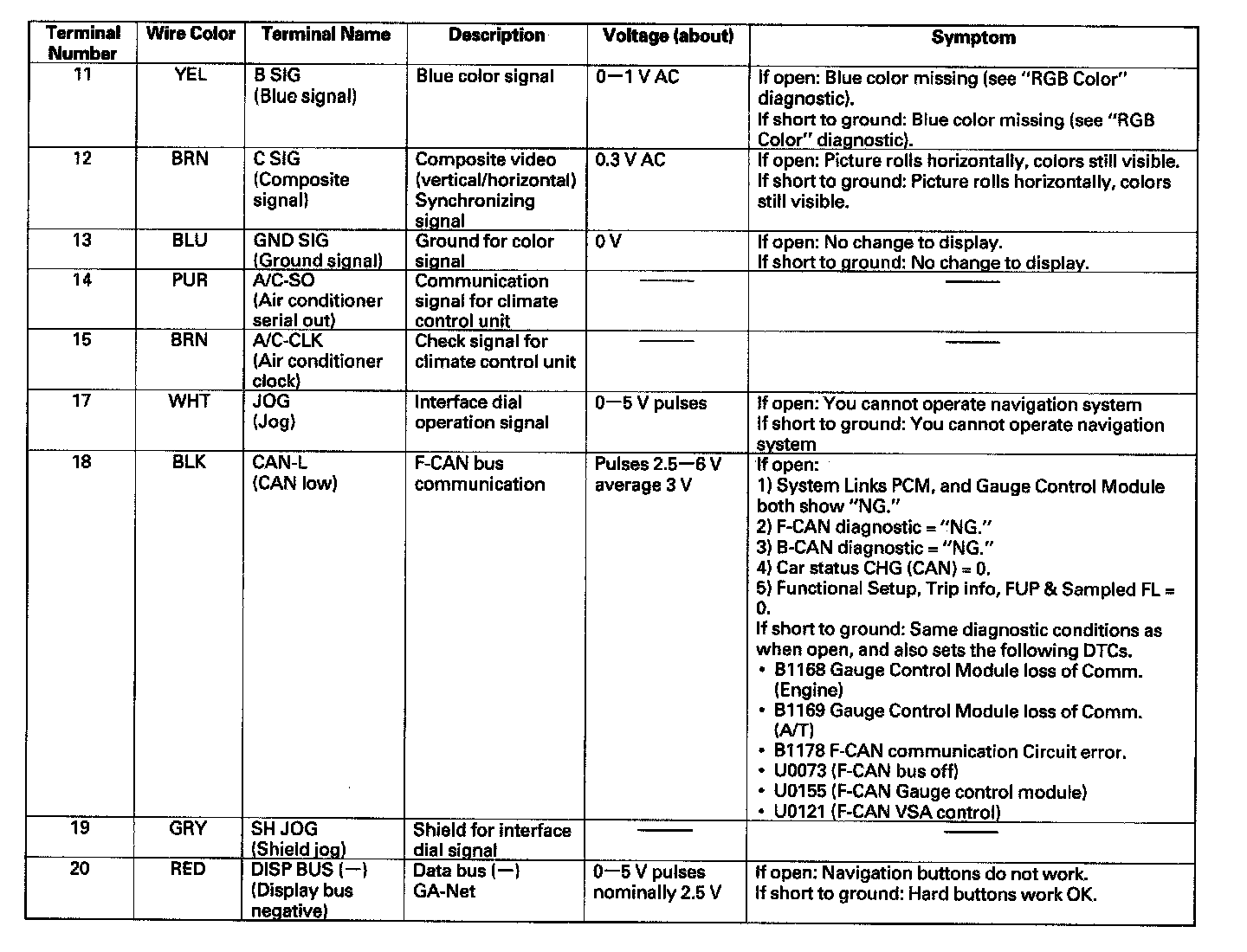 Navigation Unit Inputs And Outputs For Connector A (20P) Part 2: