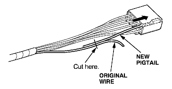 6. Lay the pigtail and the original wire side-by-side, and cut off both ends at once. If you are making more than one splice, do not cut each pigtail at the same location; the resulting "lump" of splice connectors would interfere with rewrapping the harness. Instead, cut the first pigtail close enough to the terminal so you will have room to make each remaining cut about 20 mm (3/4 inch) farther down on the next pigtail.
