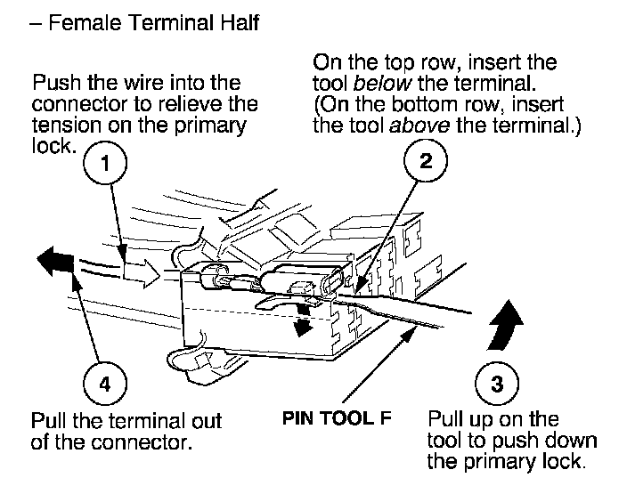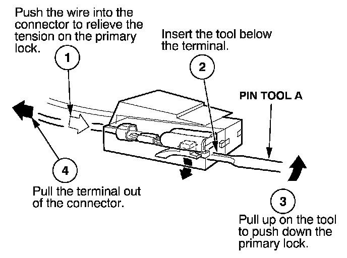 Before you begin, inspect the wire you are about to repair for damage and length. Make sure the wire will be long enough to make a terminal repair without stretching it when you reinstall the terminal in the connector. If the wire is too short, or if access to the connector is too restricted to make a terminal repair, you may need to install a pigtail terminal (a short length of wire with a factory-crimped terminal on it). Refer to HOW TO INSTALL PIGTAIL TERMINALS.