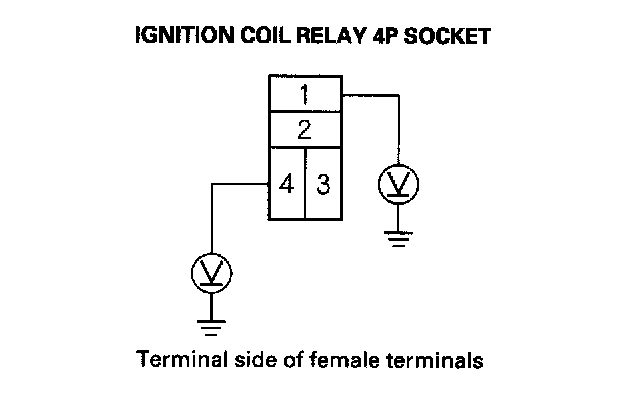 3. Measure the voltage between ignition coil relay 4P socket terminal No. 1 and body ground, then terminal No. 4 and body ground.