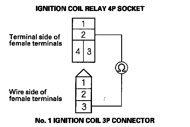 4. Check for continuity between ignition coil relay 4P socket terminal No. 2 and the No. 1 ignition coil 3P connector terminal No. 3.