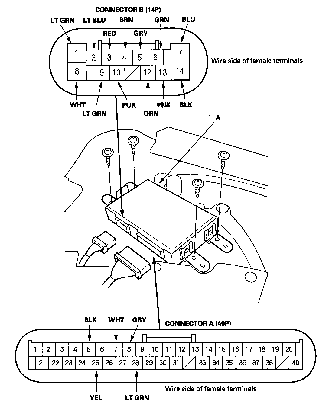 3. Disconnect the driver's MPCS unit (A) connectors A (40P) and B (14P).