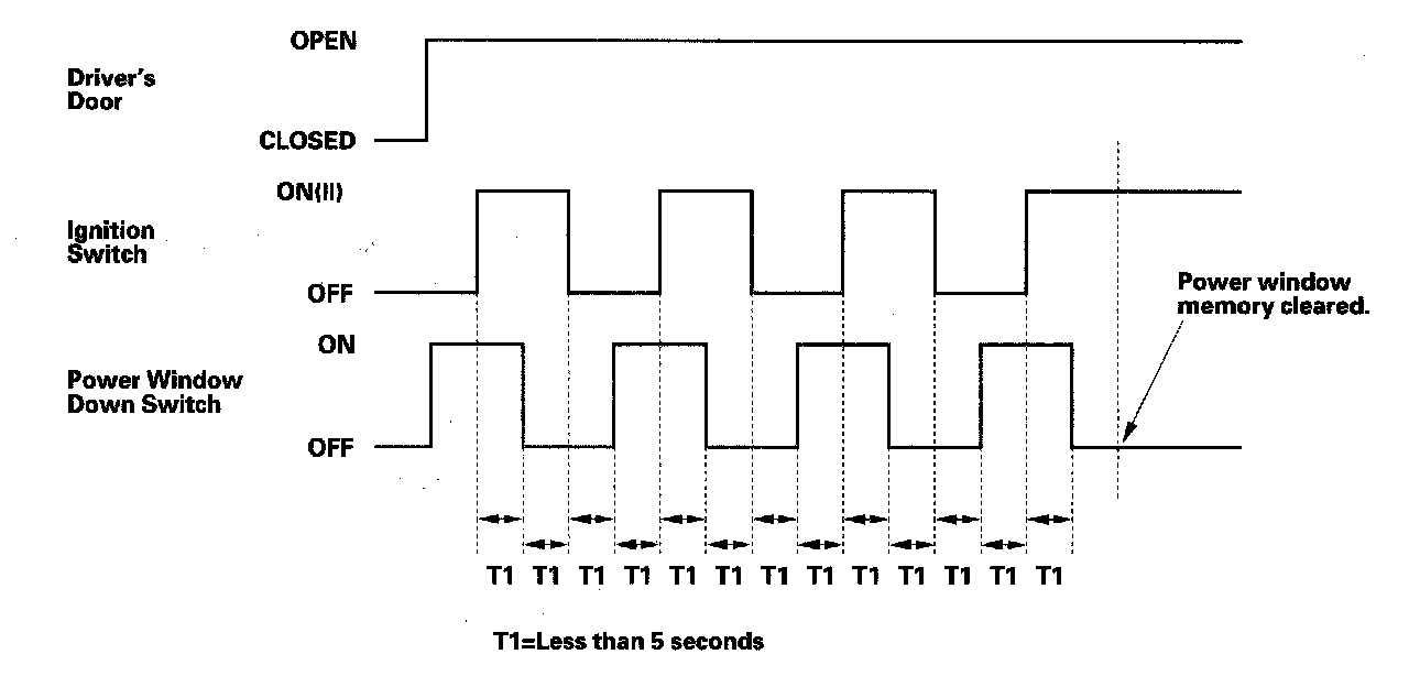 If the power window still does not work in AUTO, repeat the procedure several times, paying close attention to the 5 second time limit between steps. If it still does not work, go to B-CAN System Diagnosis Test Mode A. Troubleshooting - B-CAN System Diagnosis Test Mode A