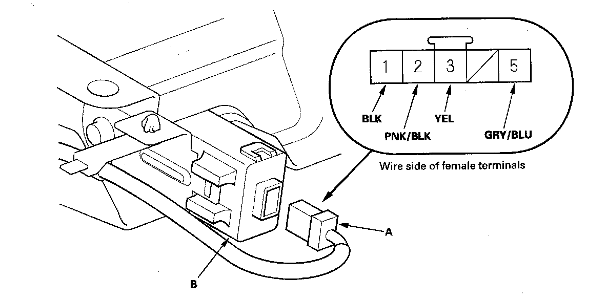 2. Disconnect the 5P connector (A) from the keyless receiver unit (B).