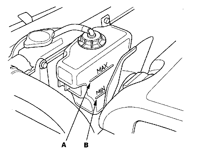 Coolant Check1. Look at the coolant level in the coolant reservoir. Make sure it is between the MAX mark (A) and MIN mark (B).