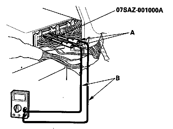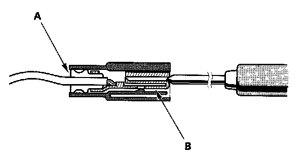 3. If you cannot get to the wire side of the connector or the wire side is sealed (A), disconnect the connector, and probe the terminals (B) from the terminal side. Do not force the probe into the connector.
