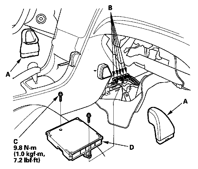 10. Remove the bolts (C), then remove the ECM/PCM (D).