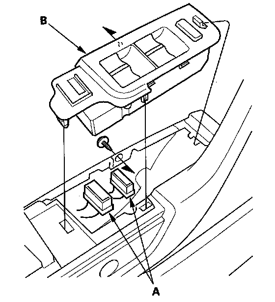 2. Remove the screw and disconnect the connectors (A) from the master switch (B), then remove the switch assembly from the door panel.